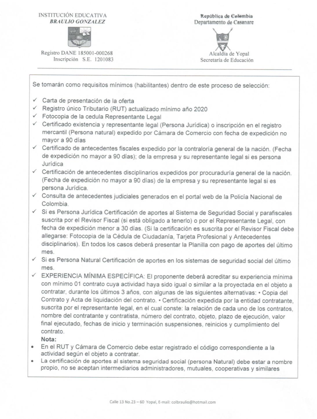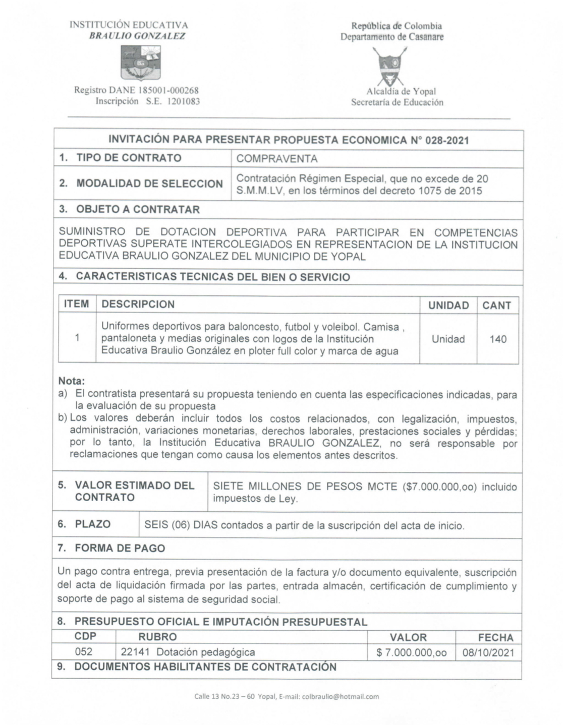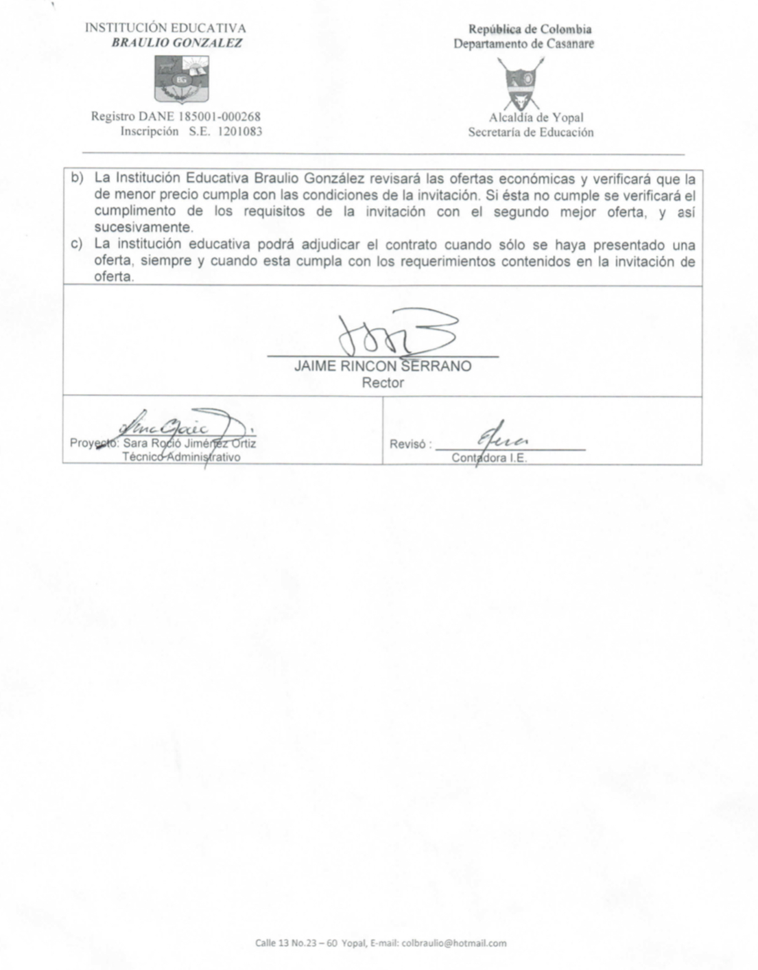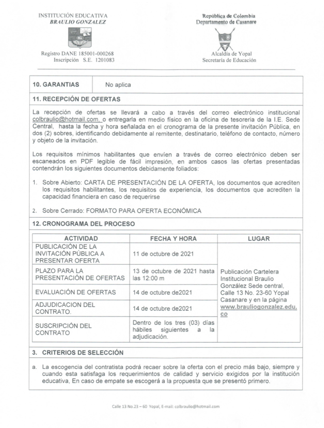 INVITACIÓN PARA PRESENTAR PROPUESTA ECONÓMICA Hora de inicio 8:00 am 12 octubre, 2021 Tiempo de finalización 12:00 pm 13 octubre, 2021 Participantes del evento Jaime Rincón Serrano Rector Ligia Bautista Ortiz Psicoorientadora Sede Central Yolanda Carvajal Leal Coordinadora Simón Bolivar Oswaldo Rozo Coordinador Sede Campestre Gloria Medina Caceres Coordinadora Sede Central Compartir: