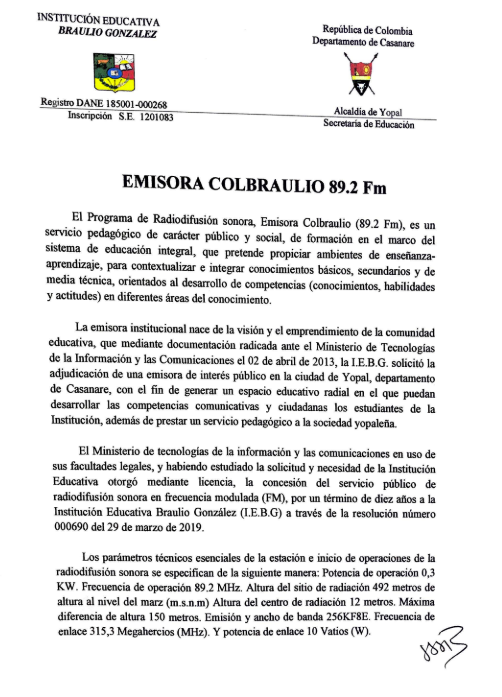 El Programa de Radiodifusión sonora, Emisora Colbraulio (89.2 Fm), es un
