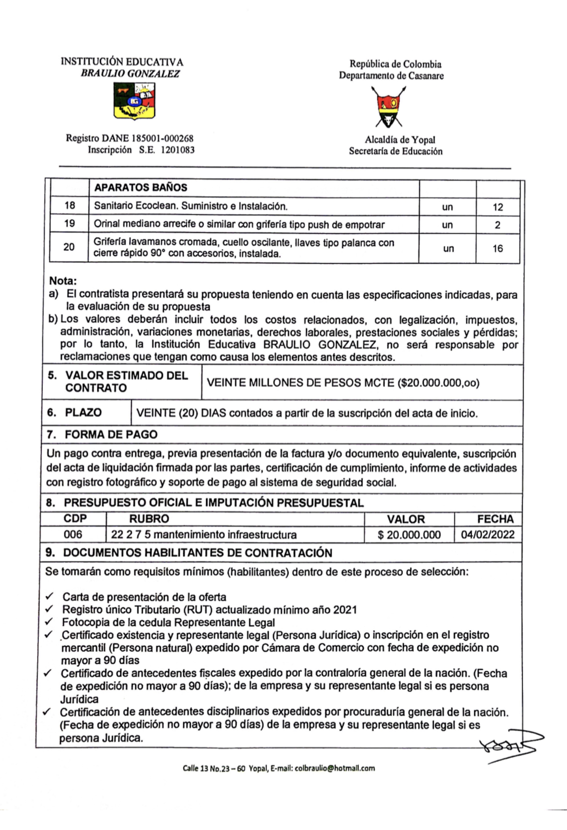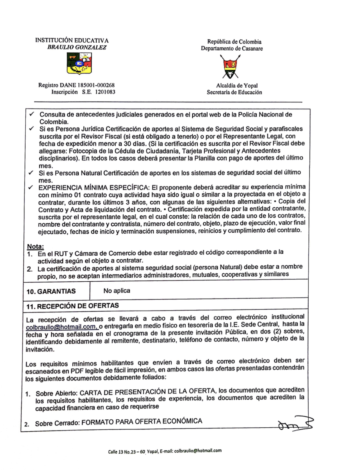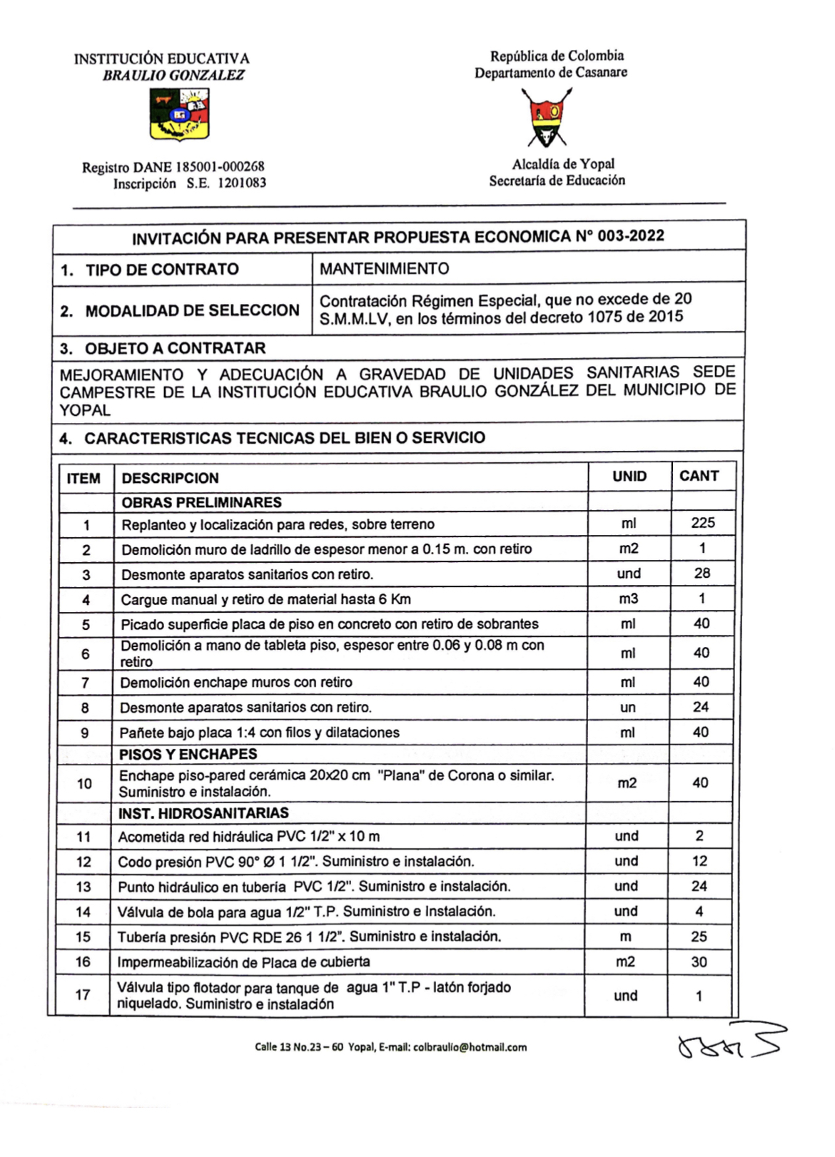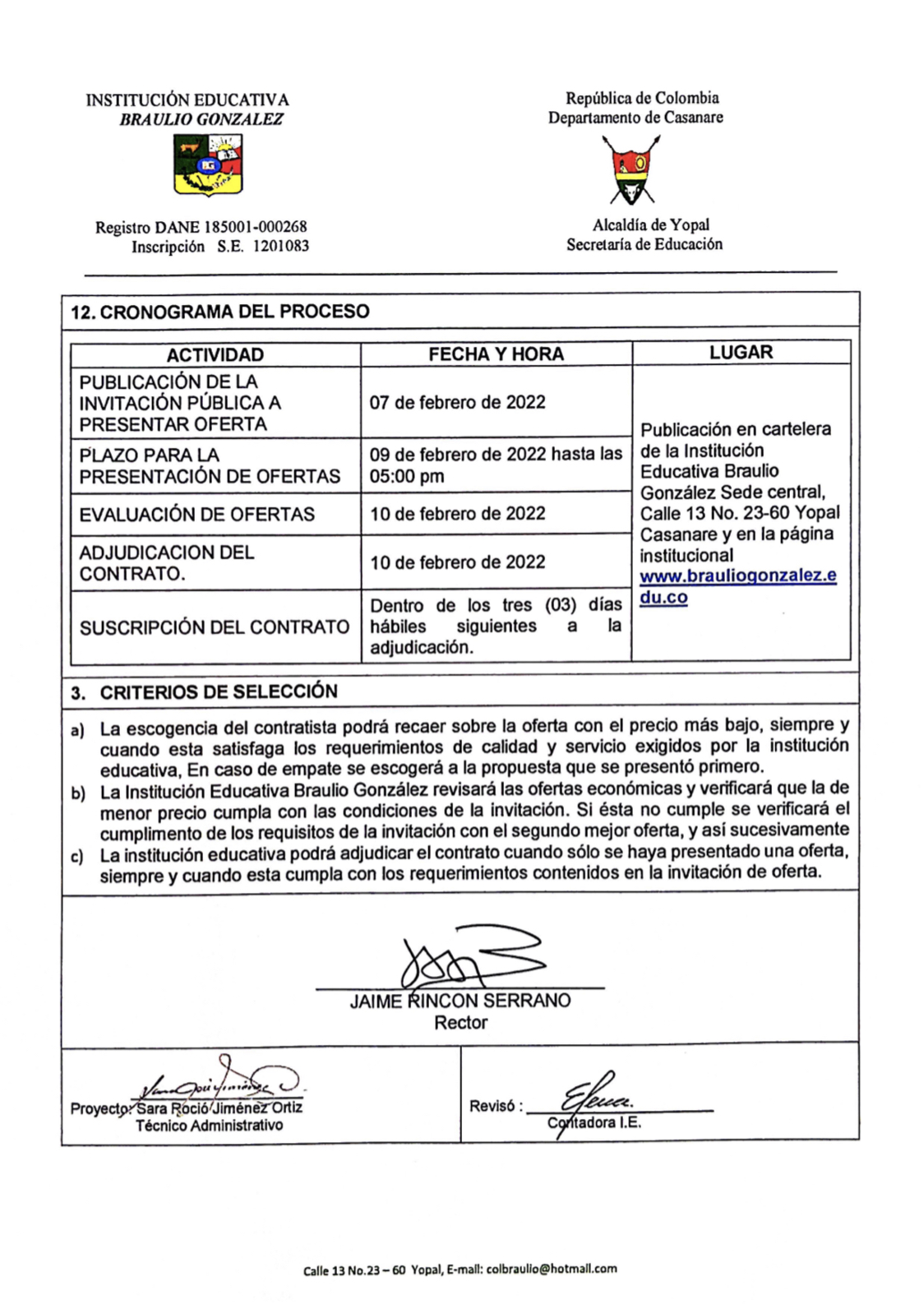INVITACIÓN PARA PRESENTAR PROPUESTA ECONÓMICA N* 003-2022 Hora de inicio 7:00 am 7 febrero, 2022 Tiempo de finalización 12:00 pm 9 febrero, 2022 Participantes del evento Jaime Rincón Serrano Rector Ligia Bautista Ortiz Psicoorientadora Sede Central Yolanda Carvajal Leal Coordinadora Simón Bolivar Oswaldo Rozo Coordinador Sede Campestre Gloria Medina Caceres Coordinadora Sede Central Compartir: