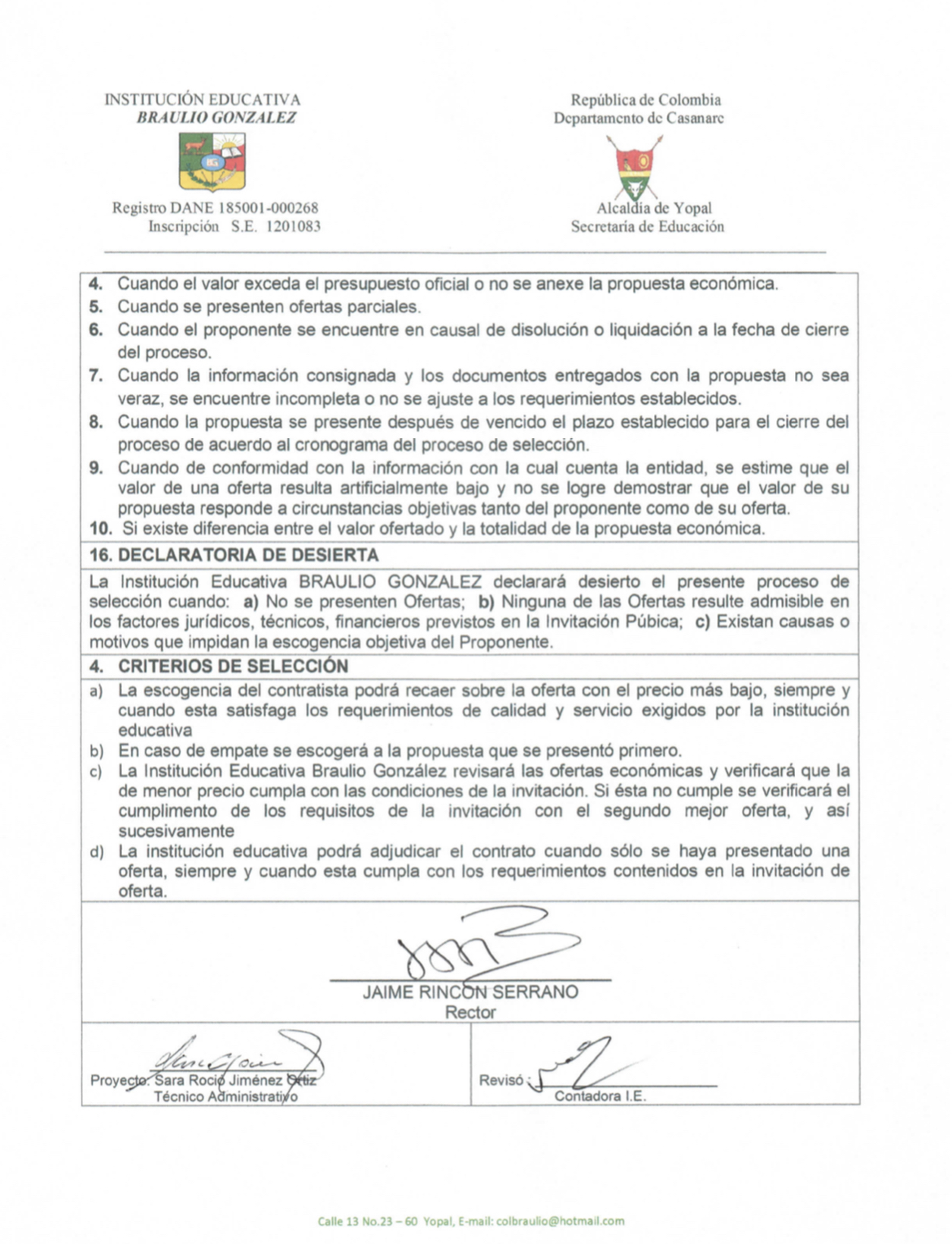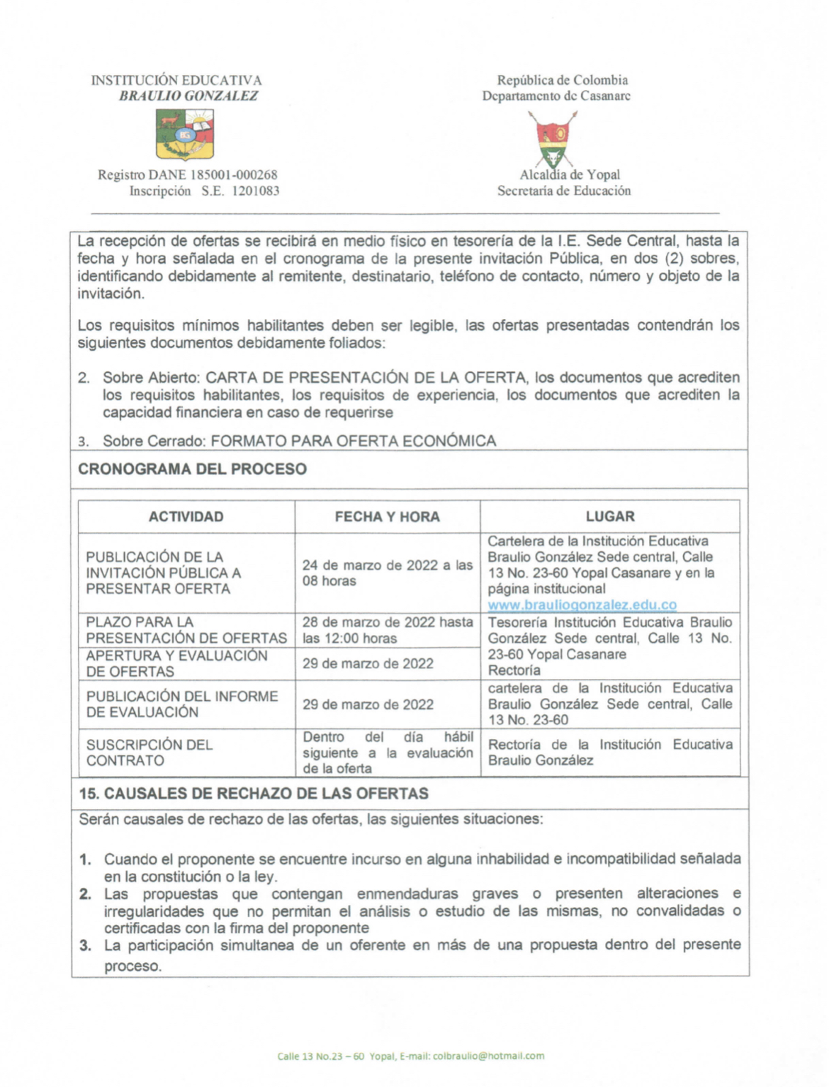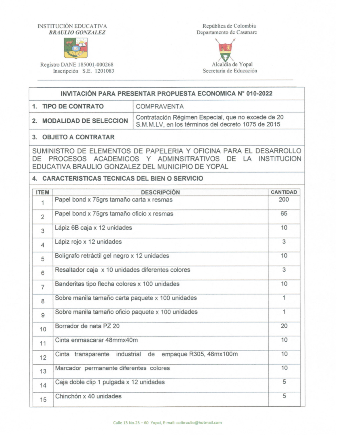 INVITACIÓN PARA PRESENTAR PROPUESTA ECONÓMICA N* 010-2022 Hora de inicio 8:00 am 24 marzo, 2022 Tiempo de finalización 12:00 pm 28 marzo, 2022 Participantes del evento Jaime Rincón Serrano Rector Ligia Bautista Ortiz Psicoorientadora Sede Central Yolanda Carvajal Leal Coordinadora Simón Bolivar Oswaldo Rozo Coordinador Sede Campestre Gloria Medina Caceres Coordinadora Sede Central Compartir: