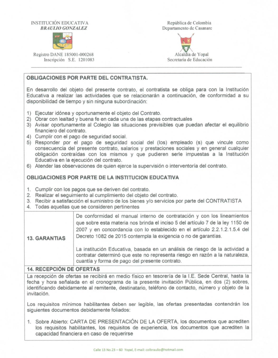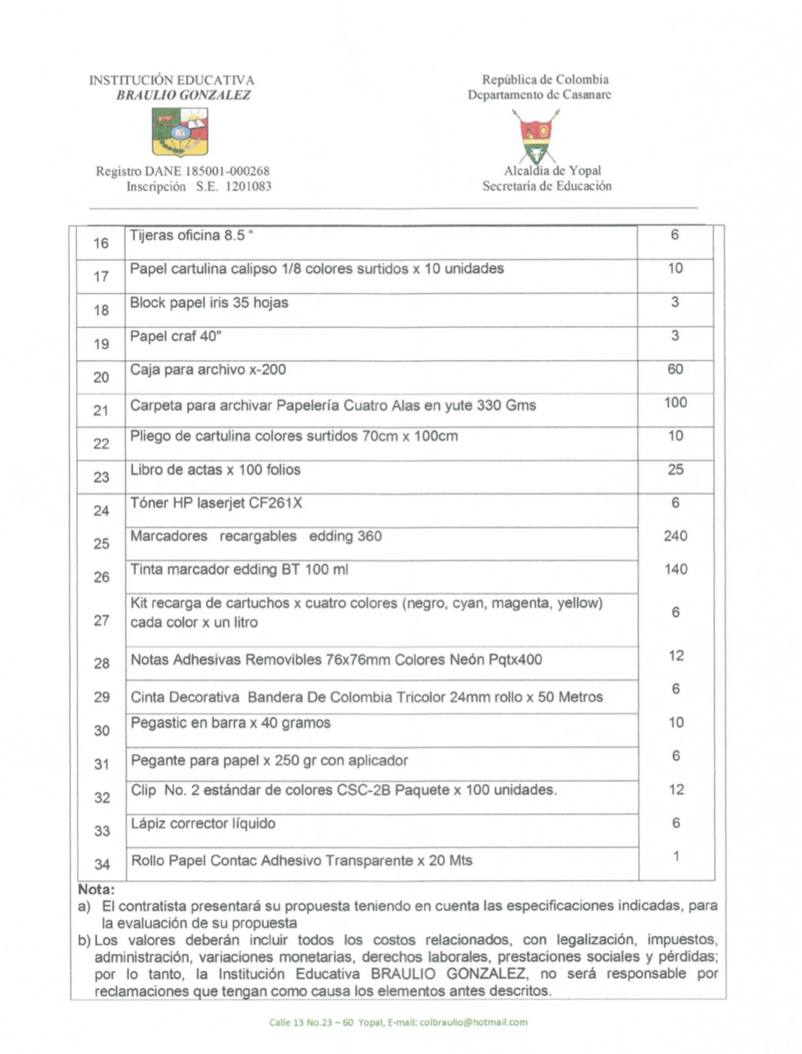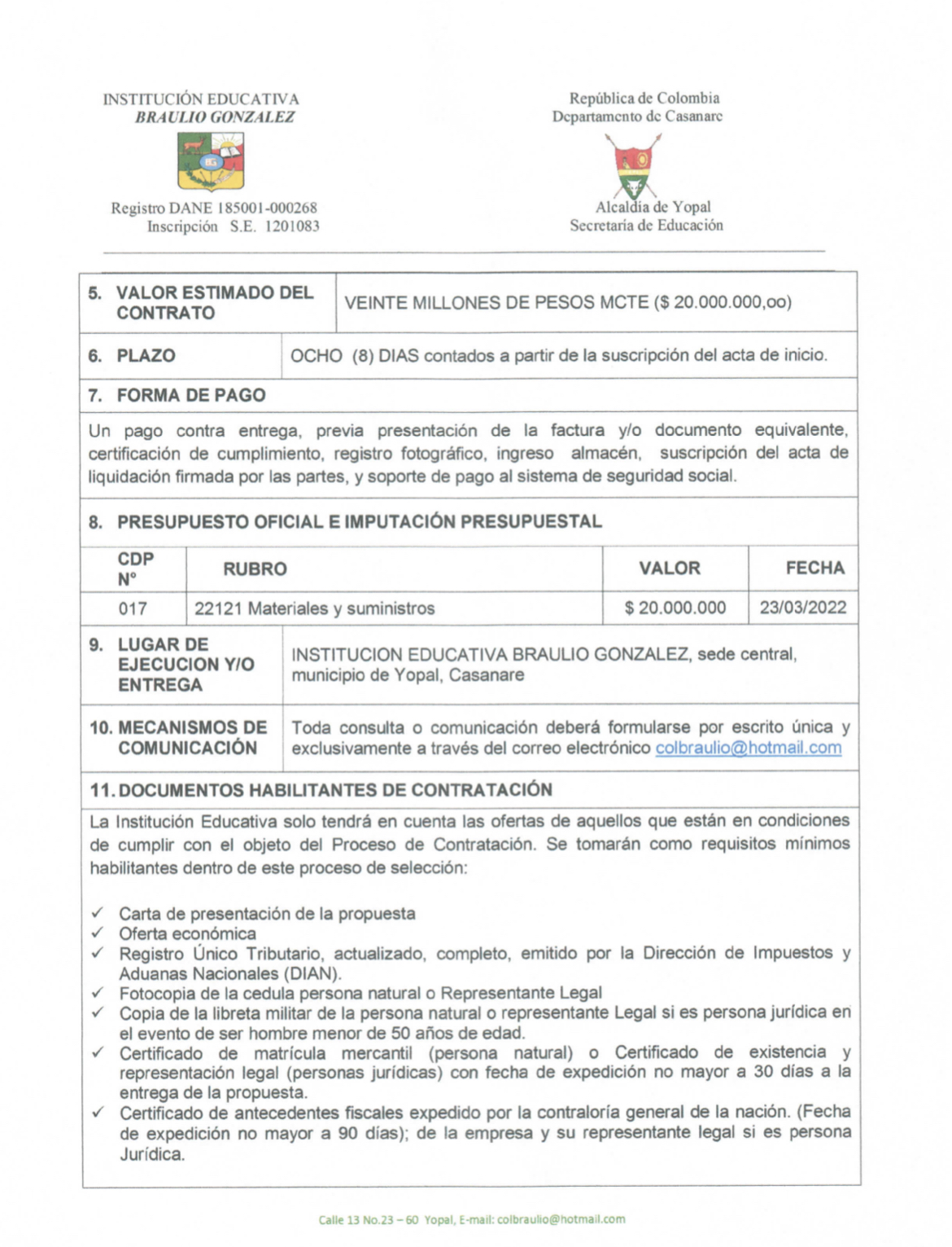 INVITACIÓN PARA PRESENTAR PROPUESTA ECONÓMICA N* 010-2022 Hora de inicio 8:00 am 24 marzo, 2022 Tiempo de finalización 12:00 pm 28 marzo, 2022 Participantes del evento Jaime Rincón Serrano Rector Ligia Bautista Ortiz Psicoorientadora Sede Central Yolanda Carvajal Leal Coordinadora Simón Bolivar Oswaldo Rozo Coordinador Sede Campestre Gloria Medina Caceres Coordinadora Sede Central Compartir: