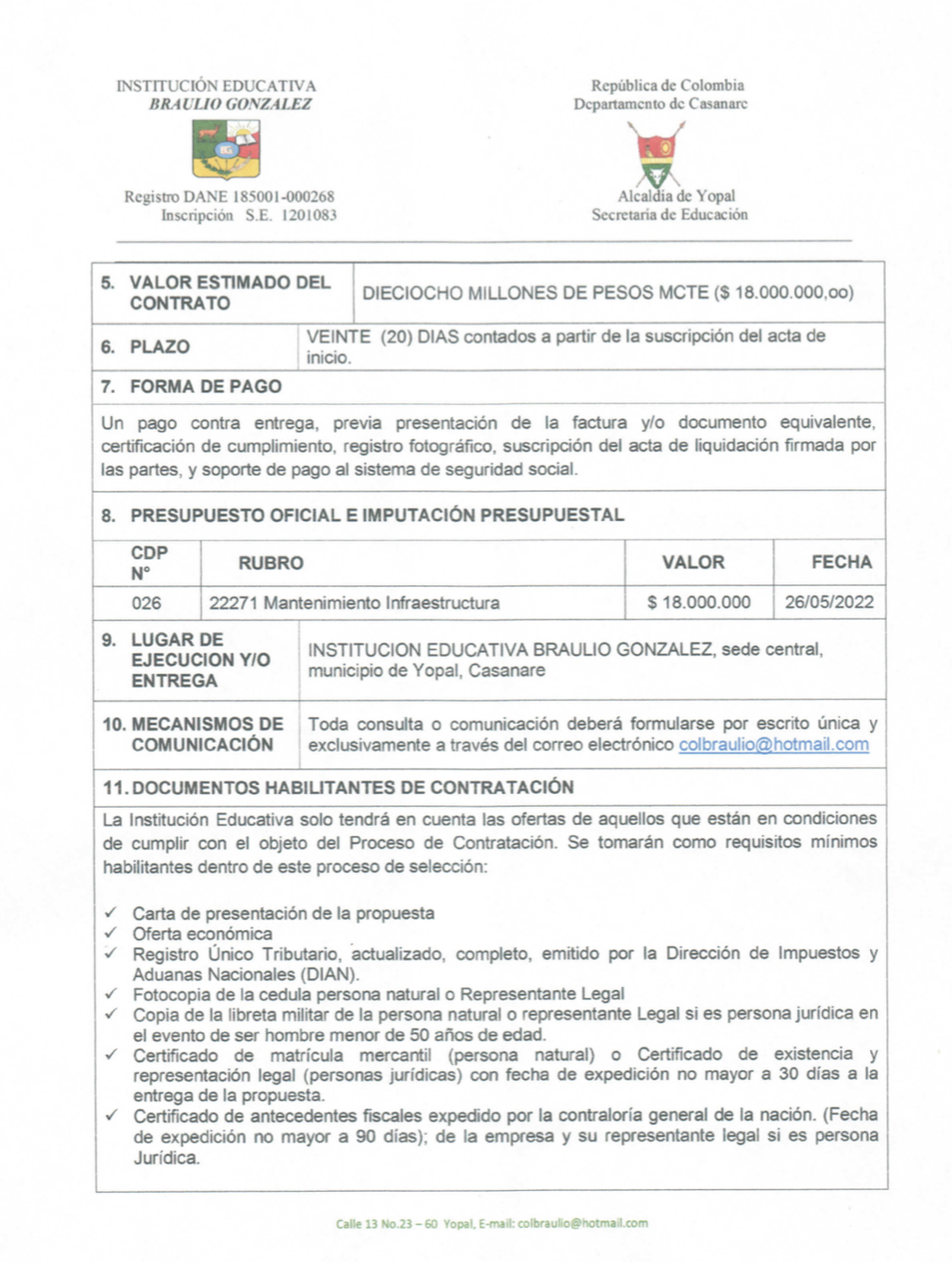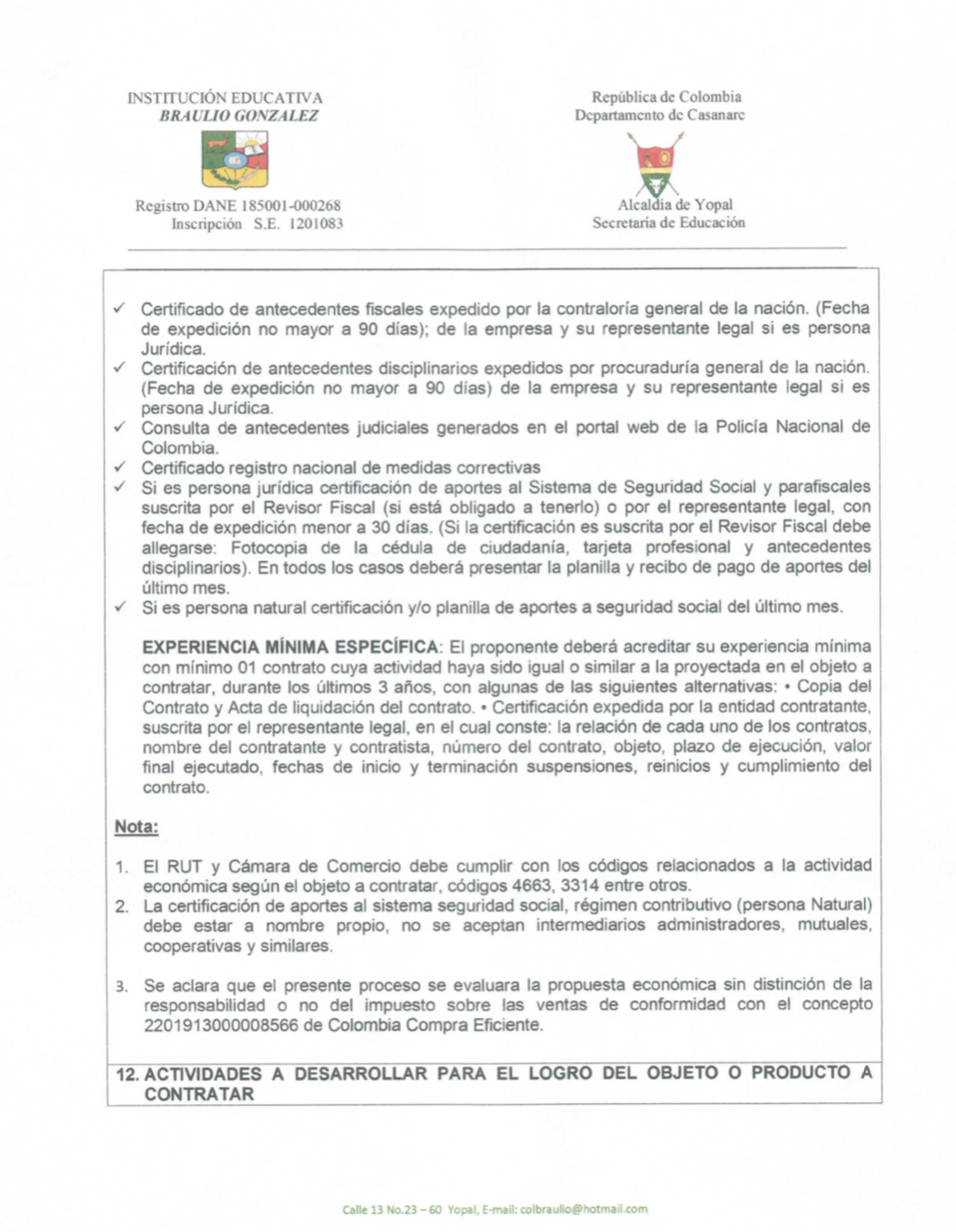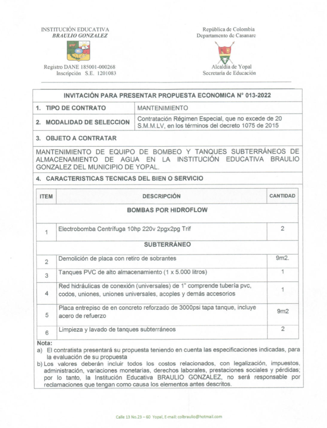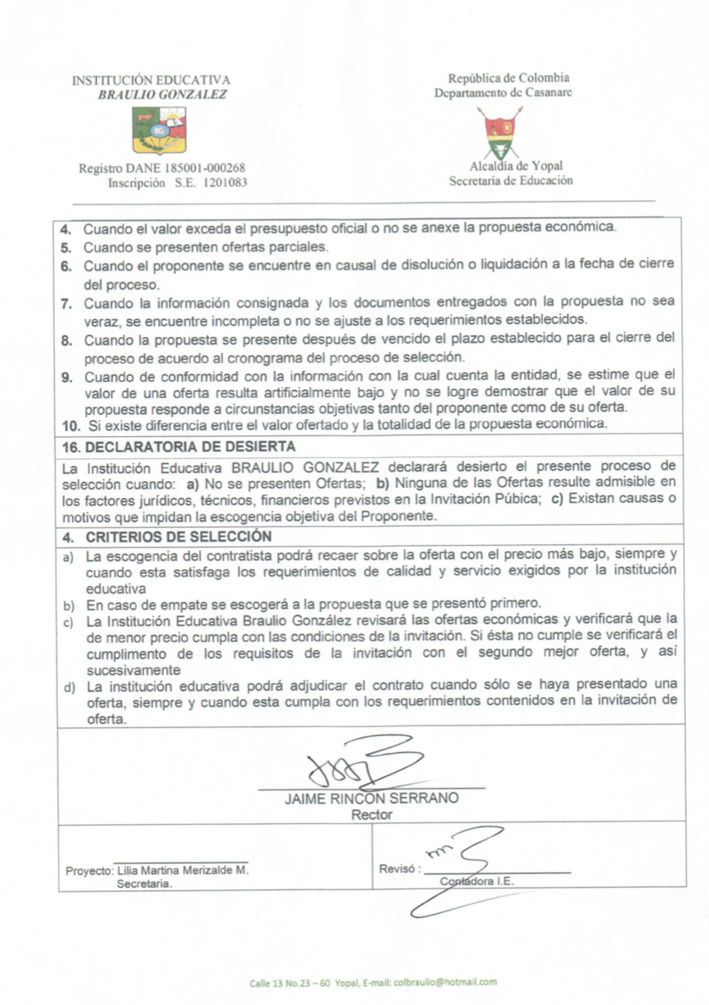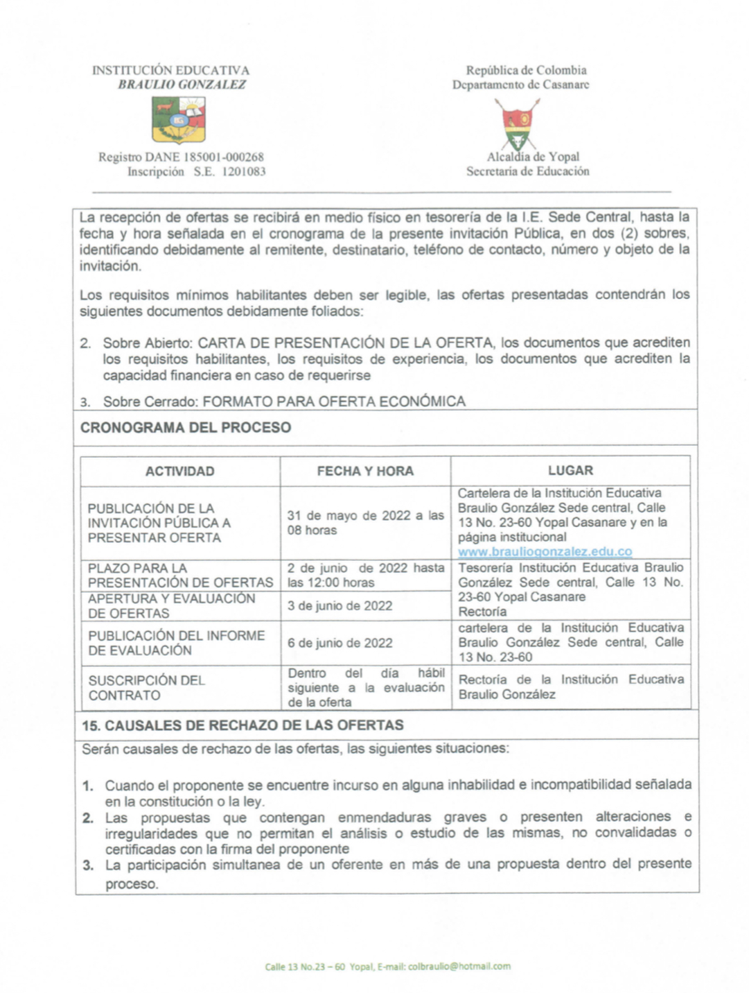 INVITACIÓN PARA PRESENTAR PROPUESTA ECONÓMICA N* 013-2022 Hora de inicio 8:00 am 31 mayo, 2022 Tiempo de finalización 12:00 pm 2 junio, 2022 Participantes del evento Jaime Rincón Serrano Rector Ligia Bautista Ortiz Psicoorientadora Sede Central Yolanda Carvajal Leal Coordinadora Simón Bolivar Oswaldo Rozo Coordinador Sede Campestre Gloria Medina Caceres Coordinadora Sede Central Compartir: