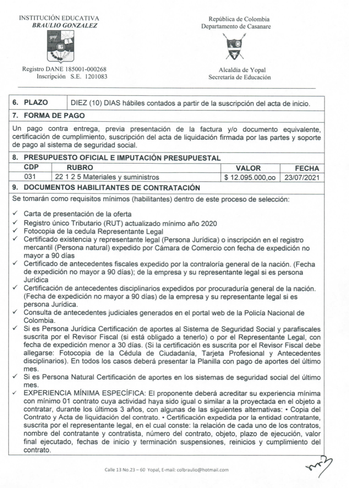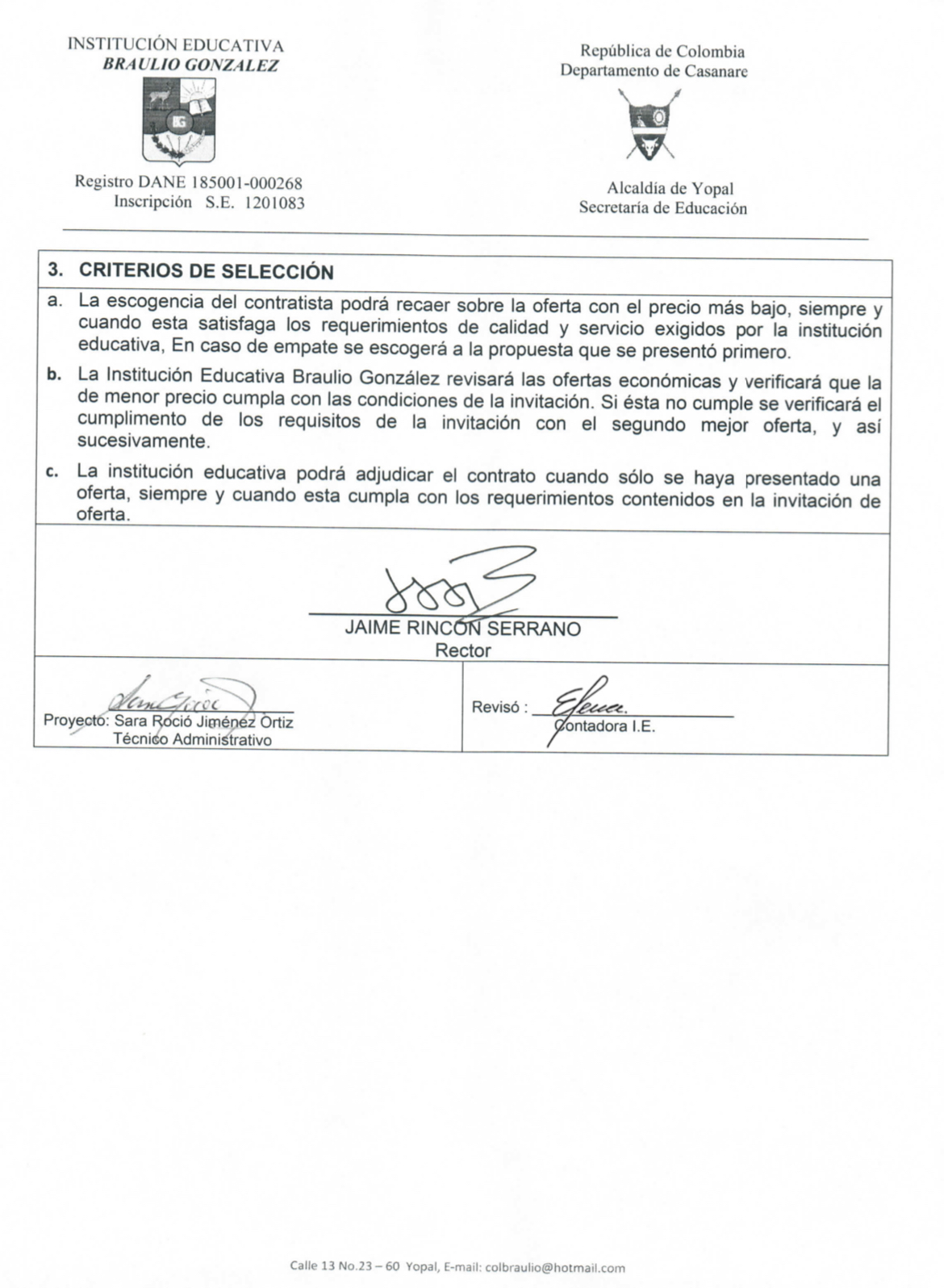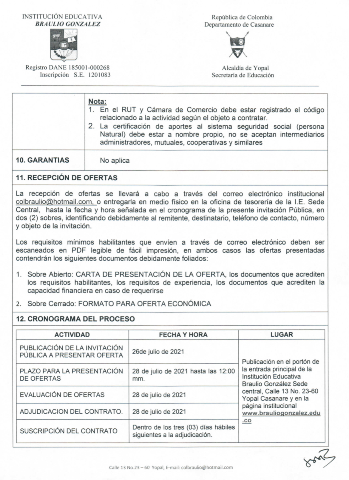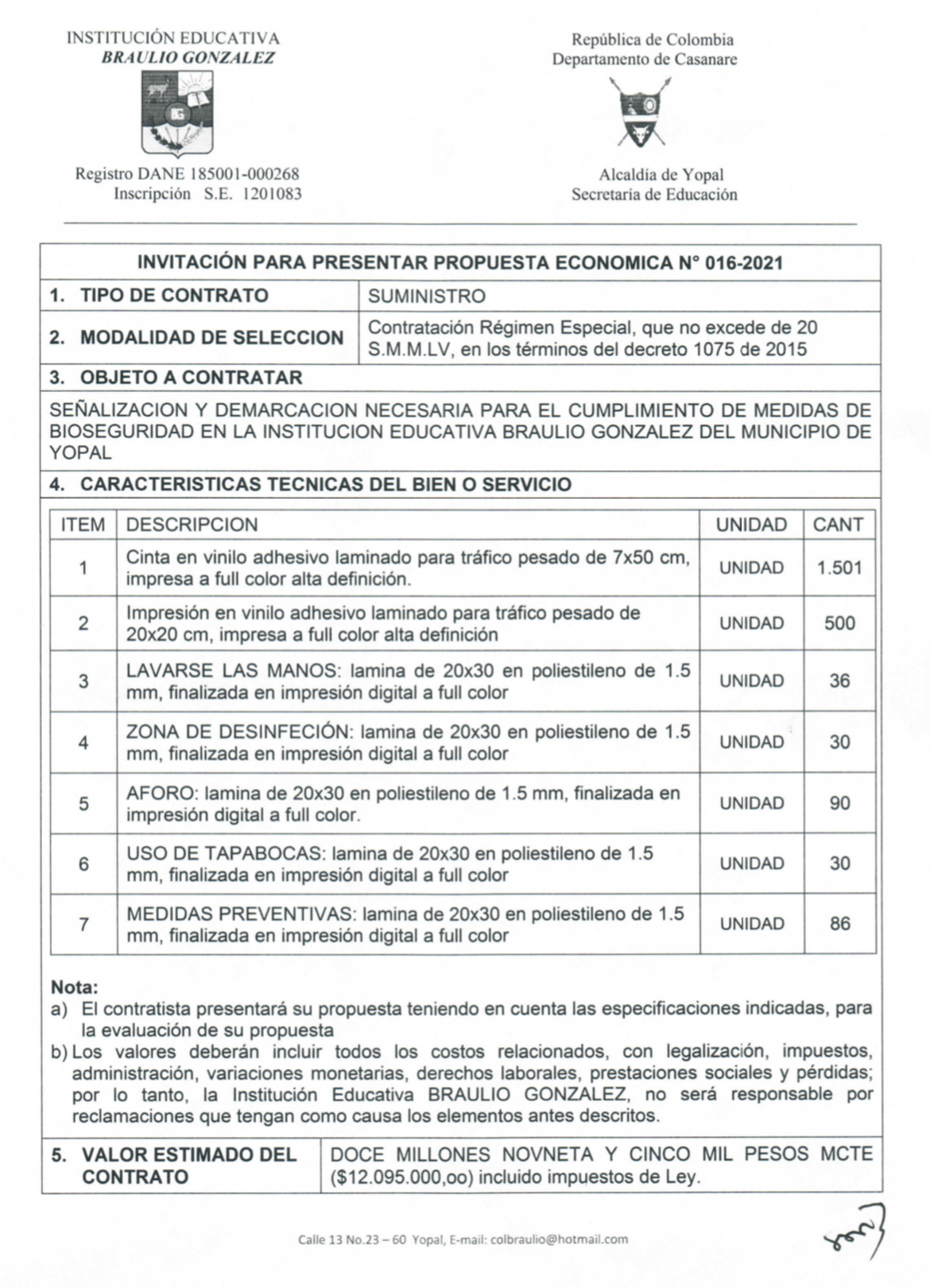 INVITACIÓN PARA PRESENTAR PROPUESTA ECONÓMICA N 016-2021 Hora de inicio 8:00 am 26 julio, 2021 Tiempo de finalización 12:00 pm 28 julio, 2021 Participantes del evento Jaime Rincón Serrano Rector Ligia Bautista Ortiz Psicoorientadora Sede Central Yolanda Carvajal Leal Coordinadora Simón Bolivar Oswaldo Rozo Coordinador Sede Campestre Gloria Medina Caceres Coordinadora Sede Central Compartir: