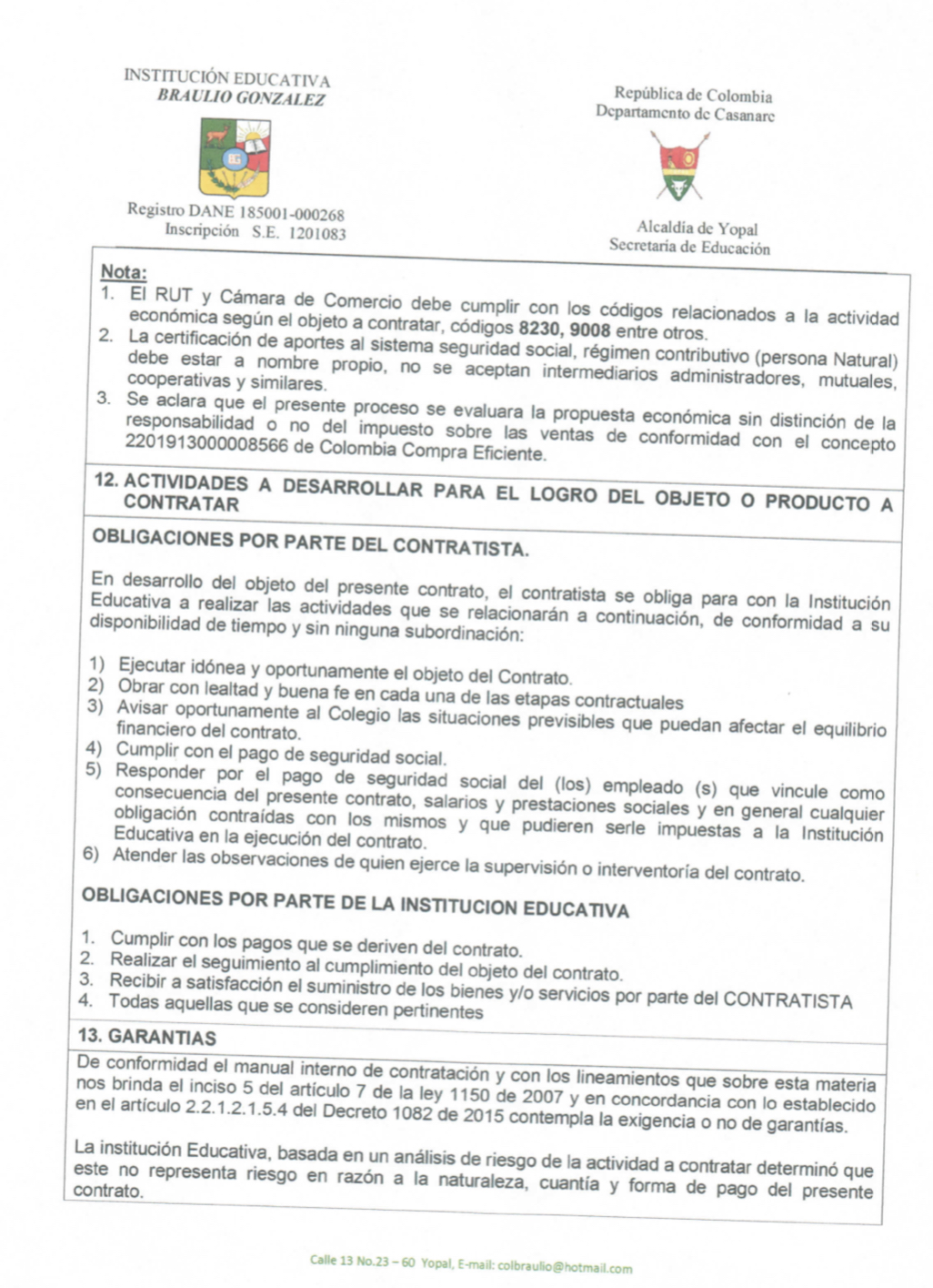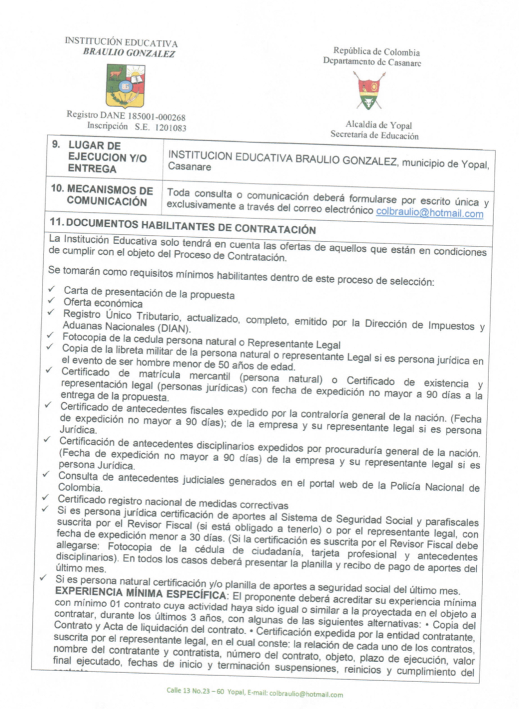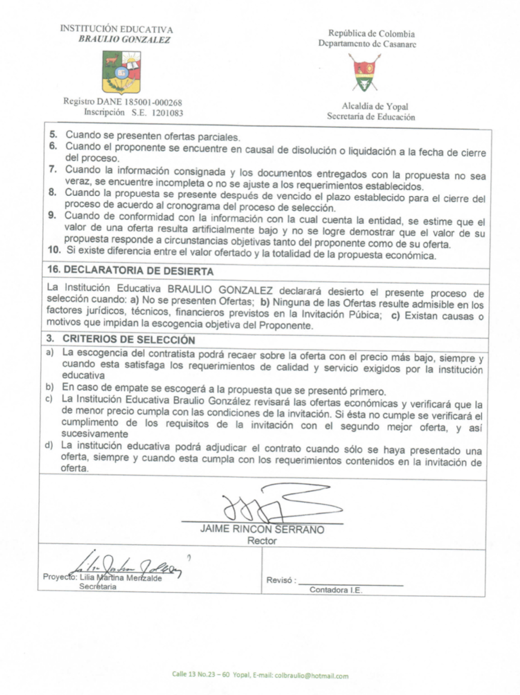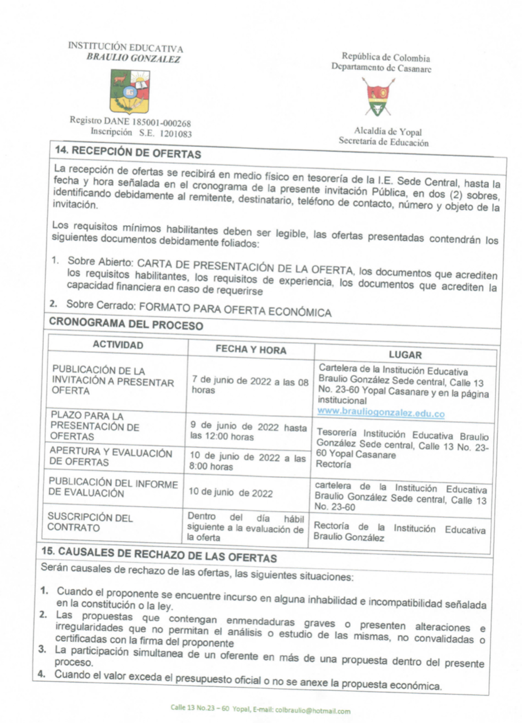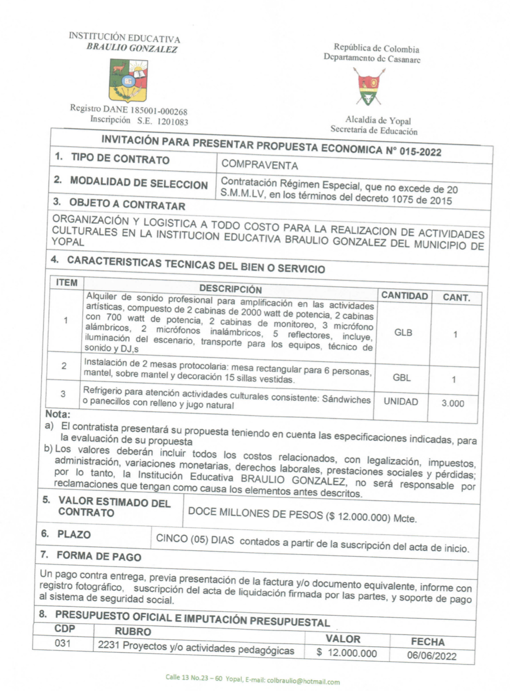 INVITACIÓN PARA PRESENTAR PROPUESTA ECONÓMICA N 016 Hora de inicio 8:00 am 7 junio, 2022 Tiempo de finalización 12:00 pm 9 junio, 2022 Participantes del evento Jaime Rincón Serrano Rector Ligia Bautista Ortiz Psicoorientadora Sede Central Yolanda Carvajal Leal Coordinadora Simón Bolivar Oswaldo Rozo Coordinador Sede Campestre Gloria Medina Caceres Coordinadora Sede Central Compartir: