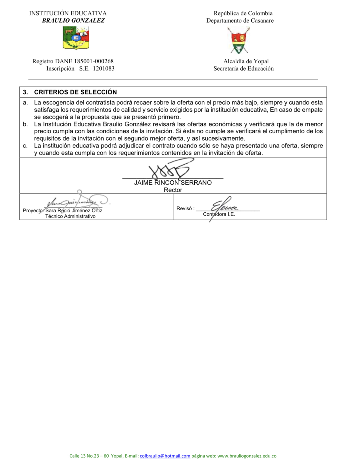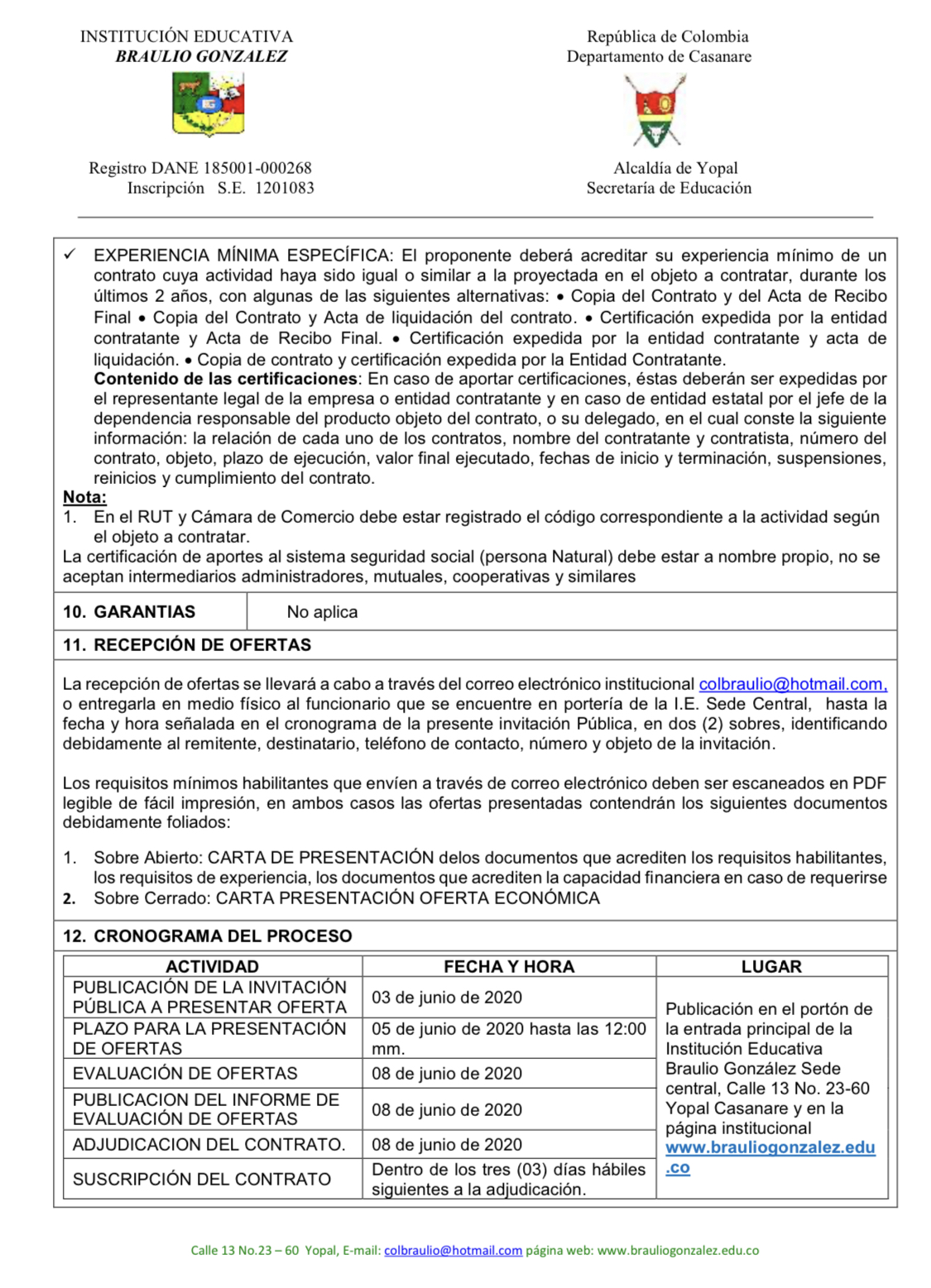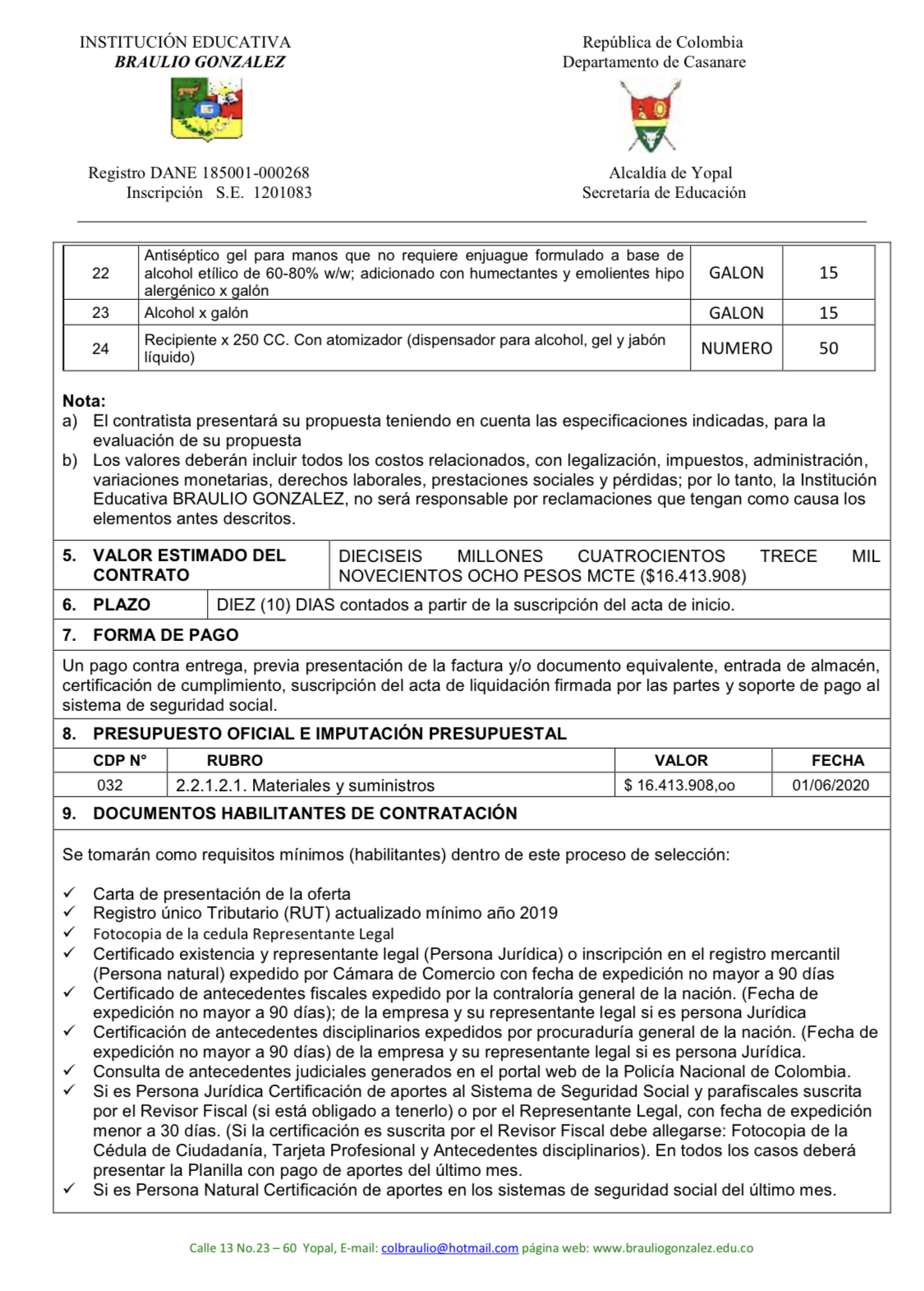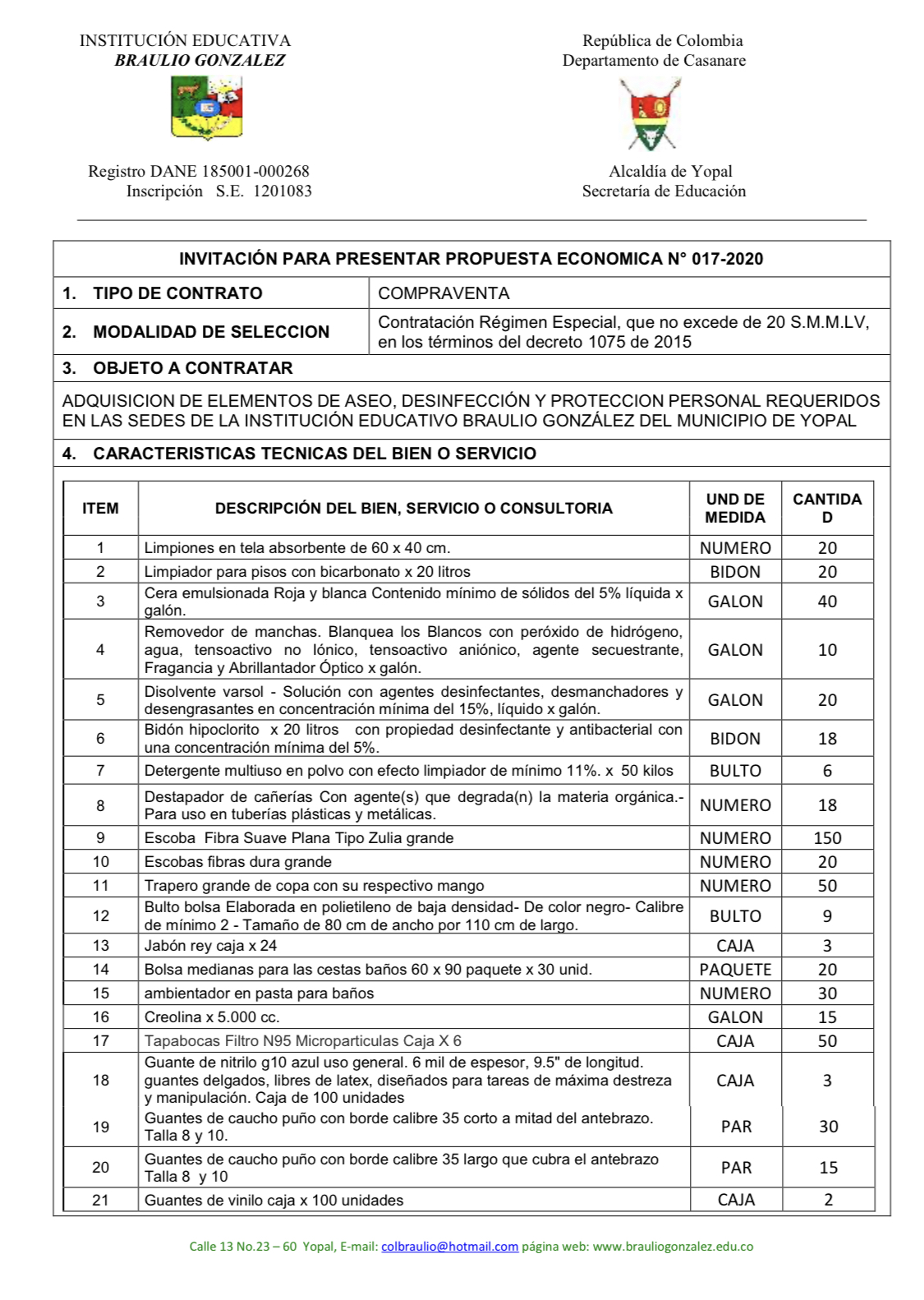 ADQUISICION DE ELEMENTOS DE ASEO, DESINFECCIÓN Y PROTECCION PERSONAL REQUERIDOS EN LAS SEDES DE LA INSTITUCIÓN EDUCATIVO BRAULIO GONZÁLEZ DEL MUNICIPIO DE YOPAL