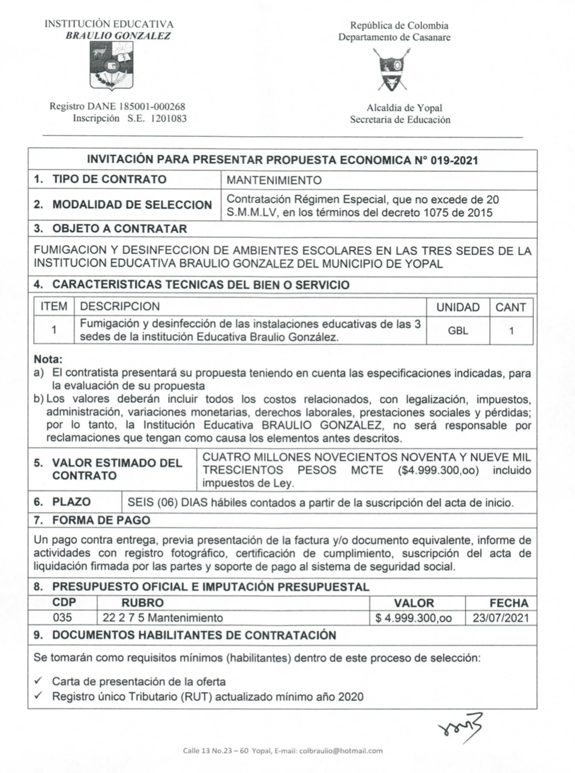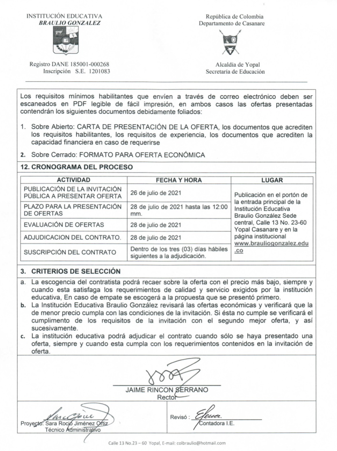 INVITACIÓN PARA PRESENTAR PROPUESTA ECONÓMICA N 019-2021 Hora de inicio 7:00 am 26 julio, 2021 Tiempo de finalización 12:00 pm 28 julio, 2021 Participantes del evento Jaime Rincón Serrano Rector Ligia Bautista Ortiz Psicoorientadora Sede Central Yolanda Carvajal Leal Coordinadora Simón Bolivar Oswaldo Rozo Coordinador Sede Campestre Gloria Medina Caceres Coordinadora Sede Central Compartir: